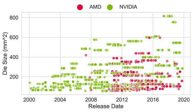 그런데 Reticle의 최대 크기가 800mm^2를 조금 넘는 수준이라 이보다 더 큰 칩을 만들어 내기는 거의 불가능합니다. 거의 불가능하다라고 말한 이유는 이론적으로 여러 개의 Reticle을 이용해 하나의 커다란 Chip을 만들 수는 있지만 nm 수준의 회로 도면에서 양 Reticle이 맞닿는 부분을 정확히 맞추기는 어렵기 때문입니다. Processor 칩의 성능을 향상시키는 방법은 설계 관점에서 Architecture의 혁신도 있지만 기본적으로 많은 수의 Transistor를 넣는 것이며 이를 위해서는 넓은 면적의 Chip이 필요합니다. 아래 그림과 같이 AMD와 엔비디아 모두 Processor 성능 향상을 위해 지속적으로 Chip size를 증가시켜 왔으며 엔비디아의 경우 한계선인 800mm^2 근처에 다다른 상황입니다. 따라서 전체 Chip size를 증가시키기 위해 여러 칩을 결합하는 칩렛이 등장하게 되었습니다.